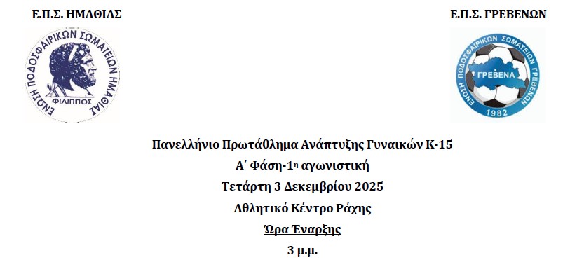 Την Τετάρτη 4/12/2025 ΕΠΣ Ημαθίας - ΕΠΣ Γρεβενών στη κατηγορία Κ15 Γυναικών