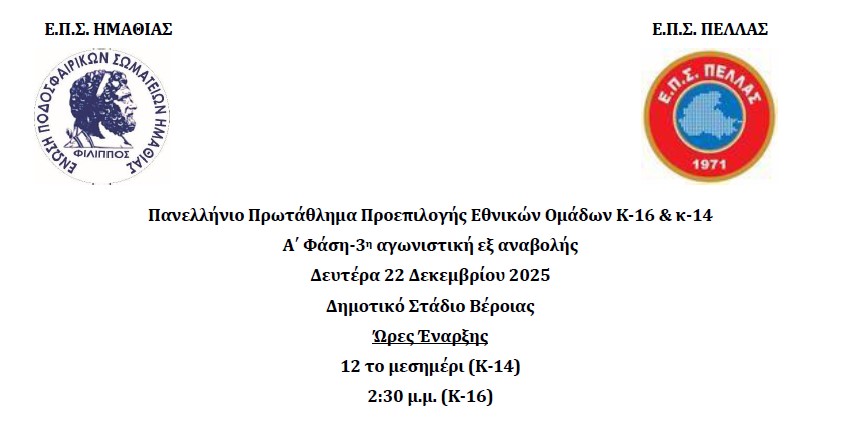 ΕΠΣ Ημαθίας - ΕΠΣ Πέλλας τη Δευτέρα 22/12/2025